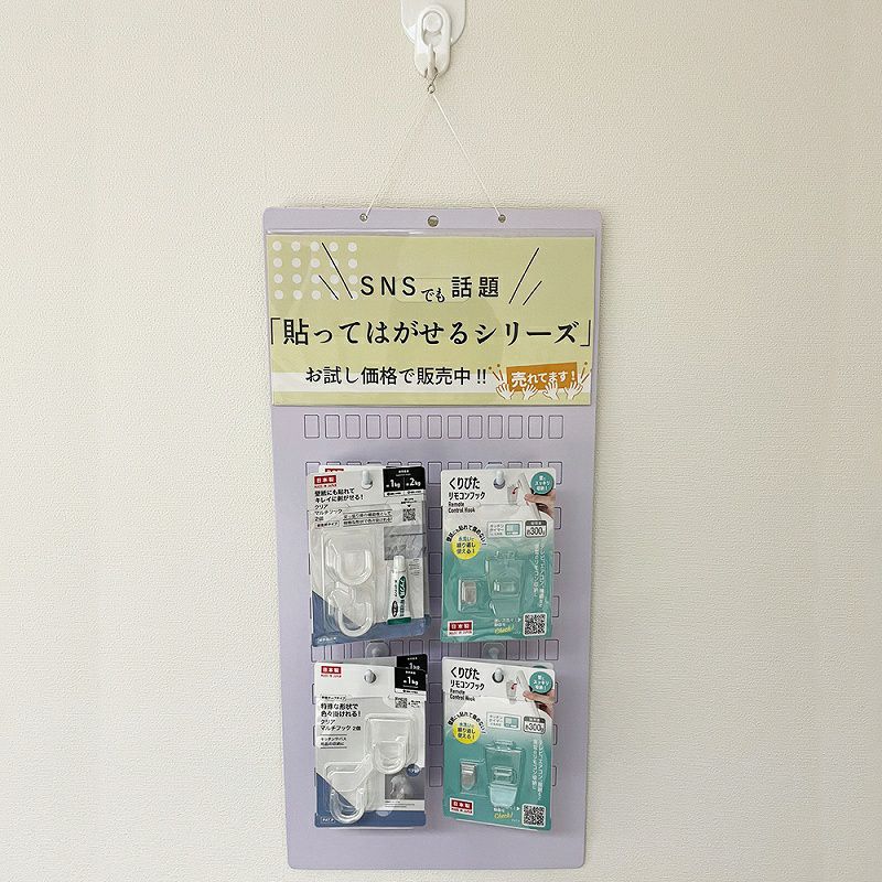 ※ボード上部の丸穴を利用してそのまま吊り下げたり、 Sカンやヒモを利用して吊り下げたりします。