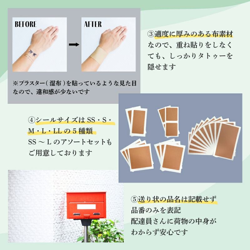 ・適度に厚みのある布素材なので、重ね貼りしなくてもタトゥーをしっかり隠せます。