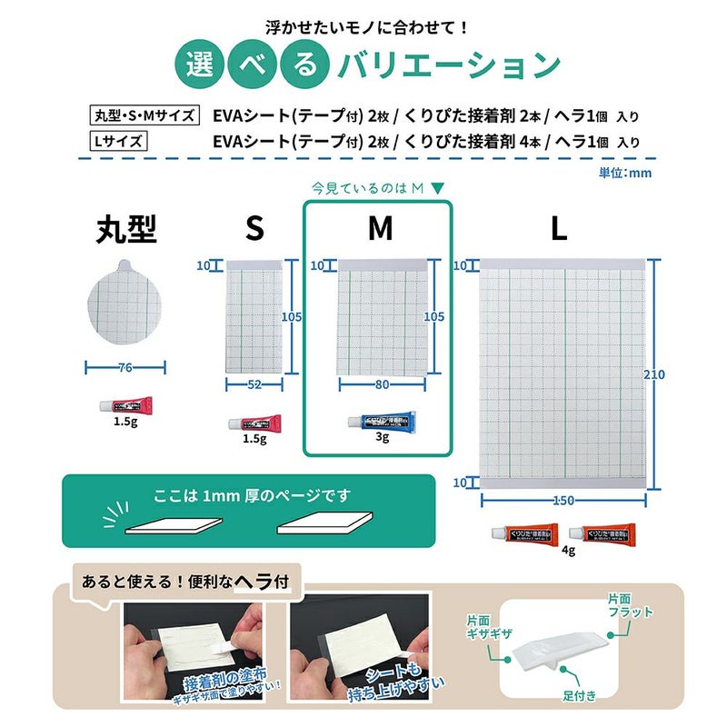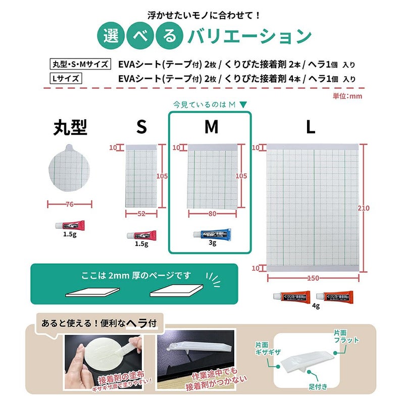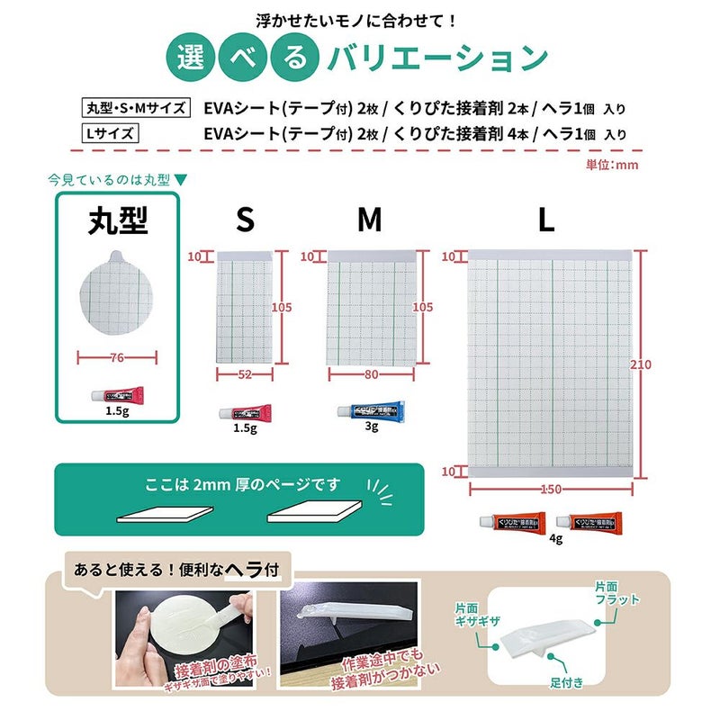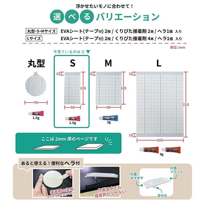 他の画像を見る 【クリックポスト対応】浮きウキEVAシート(テープ付) 2mm厚 L 約210×150mm セット くりぴた接着剤 ヘラ付 貼ってはがせる NEW 販売価格 ¥ 1,500 税込 取り付け物にふちがあってもシートの厚みで調整可能! カートに入れる お気に入りに登録する