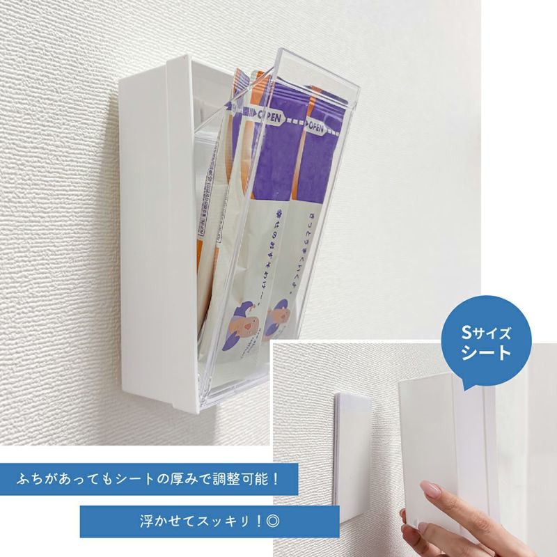 ※取り付ける収納用品は両面テープ(粘着部分)に貼り付ける面が、アクリル、プラスチック製品などの表面が平滑なものに限ります。表面にシボ 加工や凹凸があるもの、紙製品、布製品は不向きです。また、木製品は取り外しの際に表層をはがす恐れがありますのでおすすめできません。