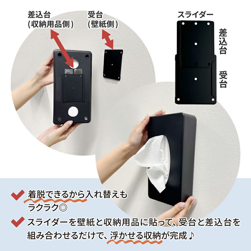 スライダーセットを使用すれば、壁紙に取り付けできなかった収納用品などが設置可能に◎