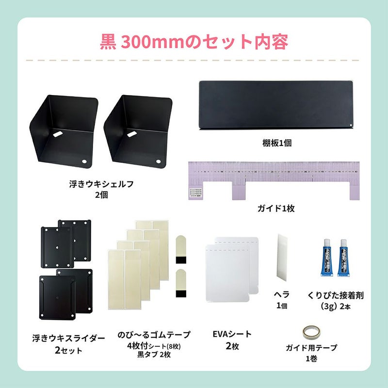 他の画像を見る 壁紙面に棚作り! 浮きウキ棚板・シェルフセット 300mm 【黒/耐荷重約2kg】 くりぴた接着剤 ヘラ付 貼ってはがせる NEW 販売価格 ¥ 4,091 税込 壁紙面に棚作り! カートに入れる お気に入りに登録する