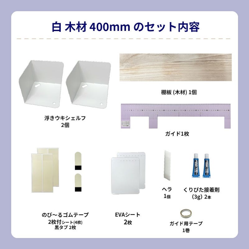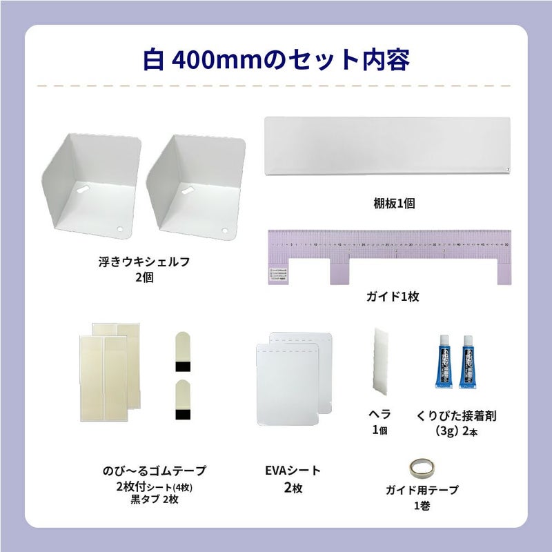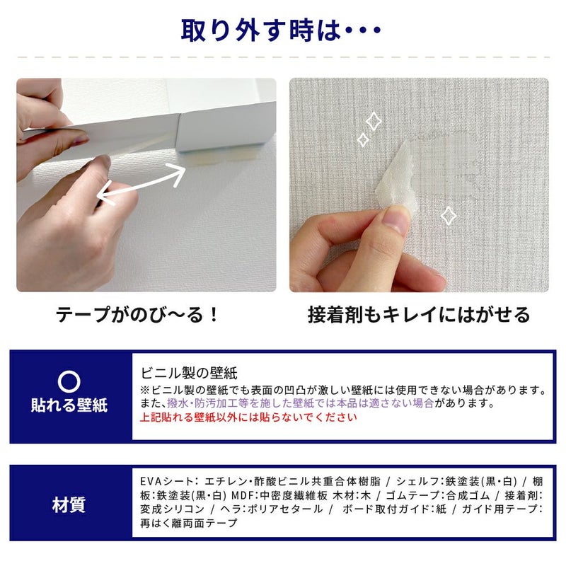 他の画像を見る 着脱可能な棚作り! 浮きウキ棚板・シェルフセット 400mm 【白/耐荷重約2kg】 くりぴた接着剤 ヘラ付 貼ってはがせる NEW 販売価格 ¥ 4,141 税込 壁紙面に棚作り! カートに入れる お気に入りに登録する