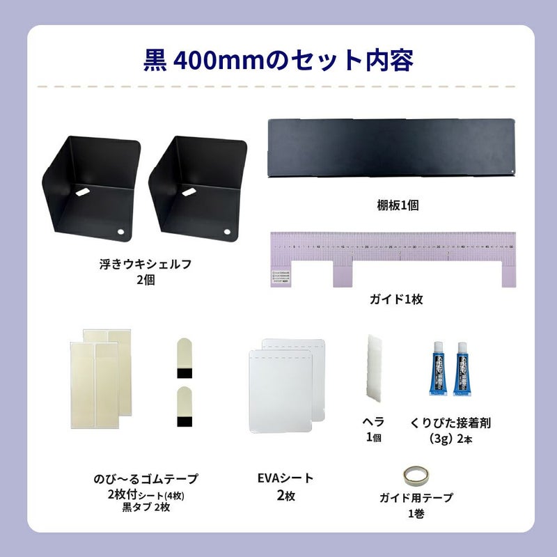 他の画像を見る 壁紙面に棚作り! 浮きウキ棚板・シェルフセット 400mm 【黒/耐荷重約2kg】 くりぴた接着剤 ヘラ付 貼ってはがせる NEW 販売価格 ¥ 4,141 税込 壁紙面に棚作り! カートに入れる お気に入りに登録する