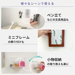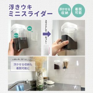 10月に販売開始しました「浮きウキスライダー」のミニサイズVer.で樹脂製の『浮きウキミニスライダー』は、浮きウキシリーズの商品ではありますが、シート類を介さず直接くりぴた接着剤を塗って壁紙面に貼るだけと手順が少ないことも特長です。また、小さくて軽いから、とても扱いやすく、掛けたものを着脱できるので、浮かせる収納づくりの強い味方です(^_-)-☆ アクリルケースやミニサイズの額飾りなどの壁面ディスプレイにもおすすめです。アイデア次第で便利に使える浮きウキミニスライダーをぜひご活用くださいませm(_ _)m