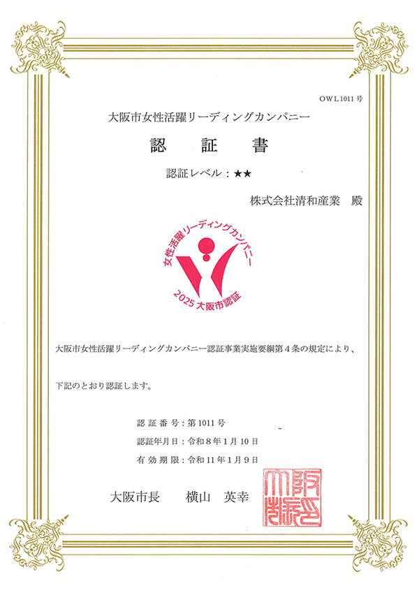 2026年1月10日、弊社は大阪市より「大阪市女性活躍リーディングカンパニー」